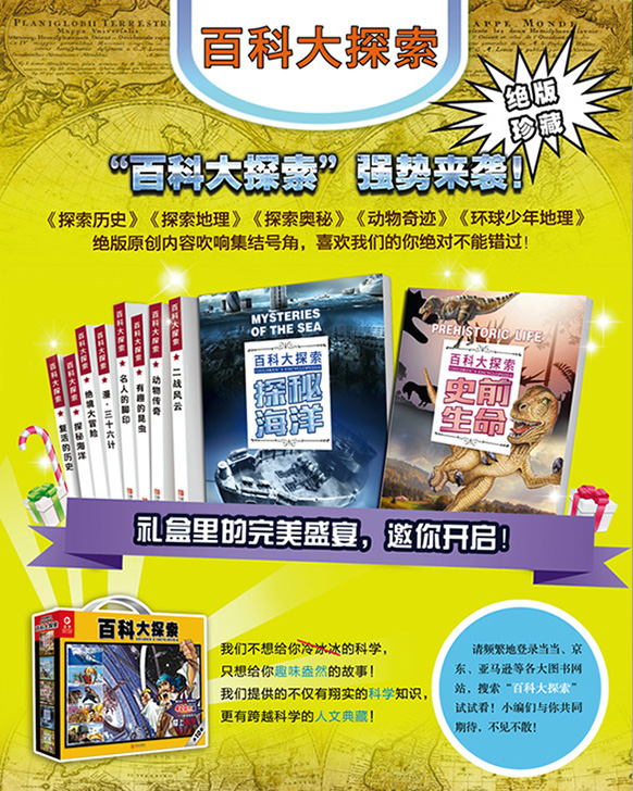 本套丛书分为十个分册,包括《复活的历史》《有趣的昆虫》《动物传奇》《史前生命》《漫•三十六计》《探秘海洋》《神奇的宇宙》《绝境大冒险》《二战风云》和《名人的脚印》。