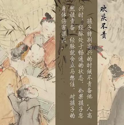 孩子特别高兴的时候不要责备他。人高兴时,经脉处于畅通的状态,如果孩子忽然被责备,经脉就会立马憋住,对孩子的身体伤害很大。
