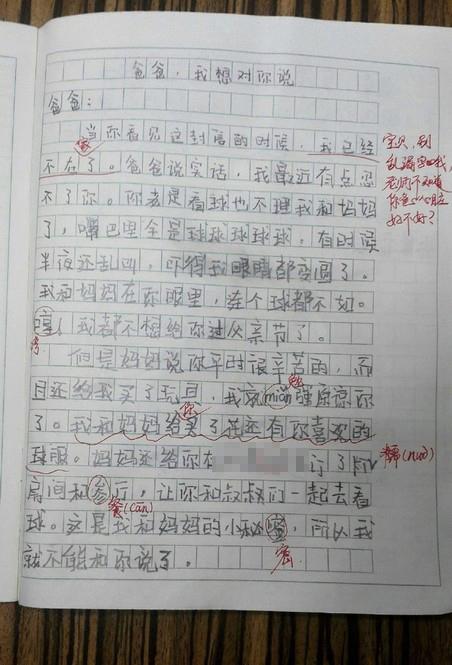 近日,一篇小学生吐槽老爸看球的作文在网上疯传。老爸看欧洲杯冷落家人,半夜乱叫影响家人休息,“我和妈妈在你眼里,连个球都不如。”原本是吐槽,最后却出现暖心一幕:“你看球没关系,我和妈妈可以陪你一起看!”想想也是温馨!