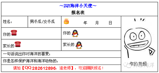 如果你热爱海洋和海洋动物,如果你愿意跟我们一起学习和宣传保护海洋、海洋动物和海洋资源的知识,请报名成为“ZQY海洋小天使”吧!